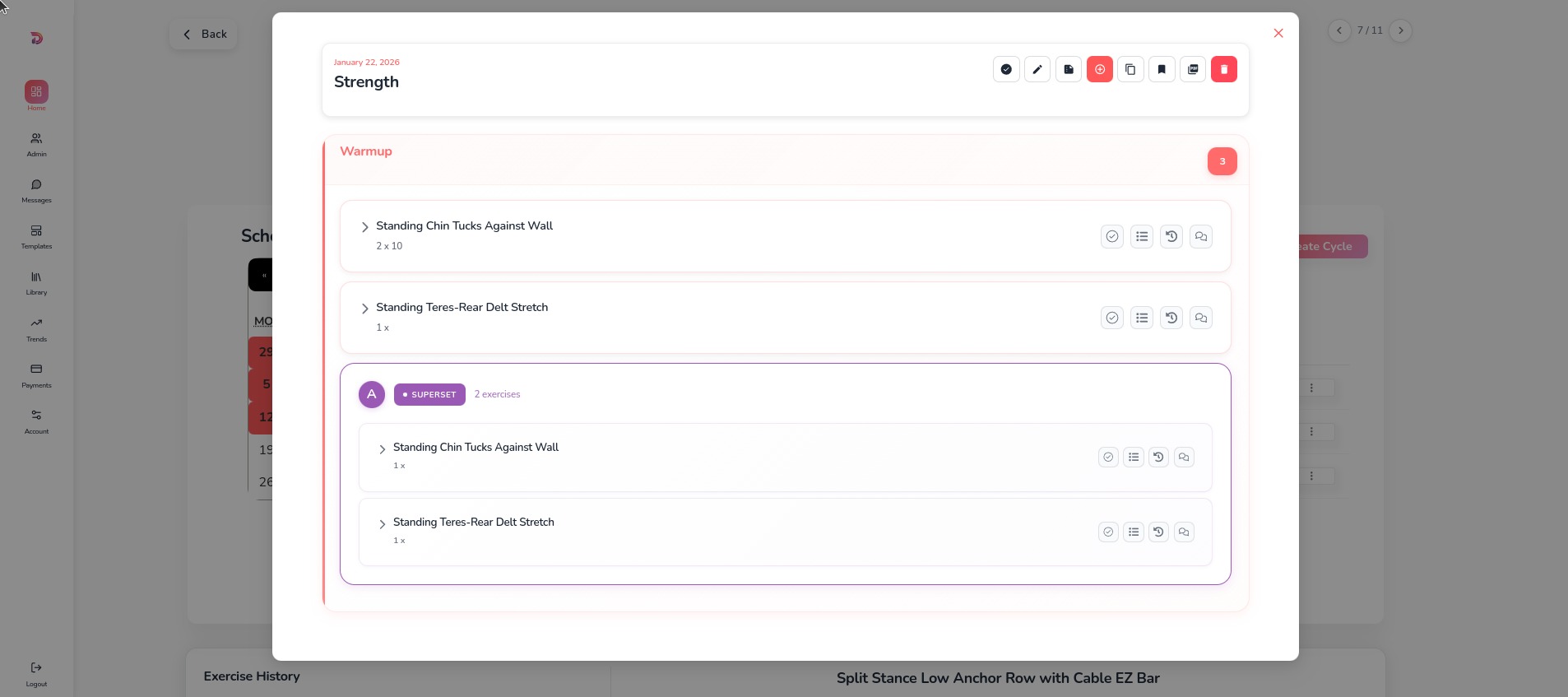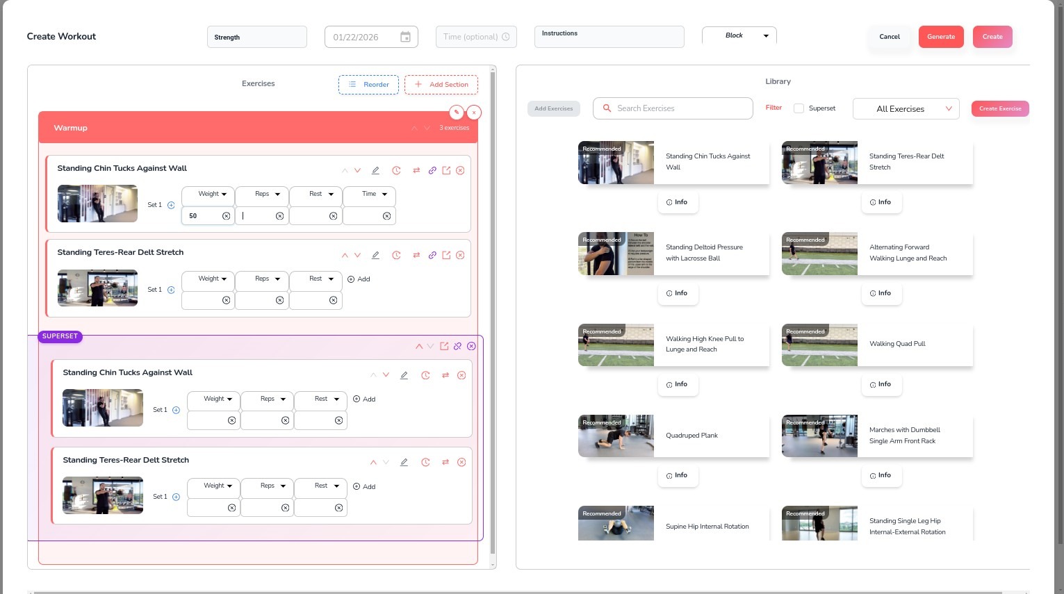 Create workouts from scratch - adding exercises, organizing with sections and supersets, reordering, setting difficulty, copying, cloning, and saving as templates