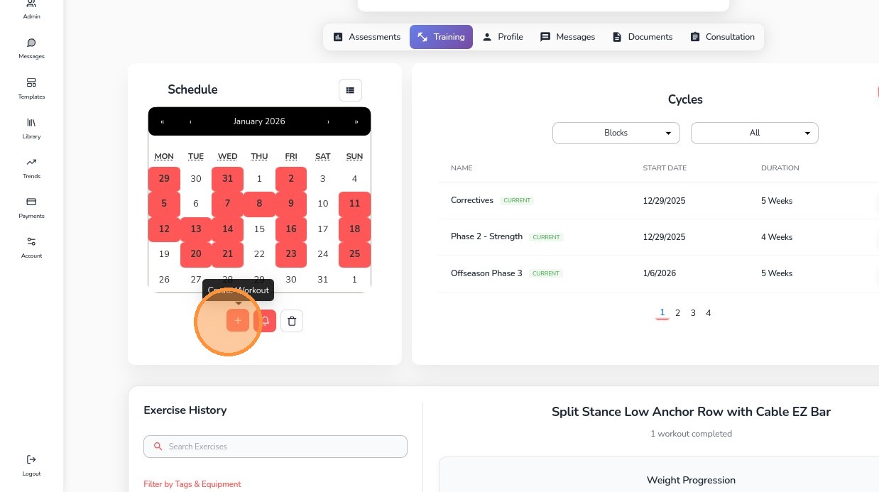 3. From here, you can create a workout in the calendar by either clicking the plus button